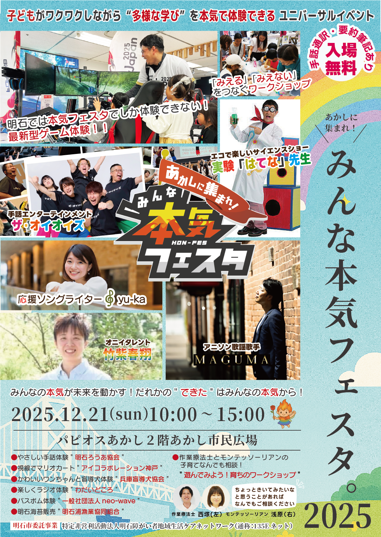 「あかしに集まれ!みんな本気フェスタ」は、明石市委託事業で特定非営利活動法人明石障がい者地域生活ケアネットワーク(略称:135Eネット)が主催し、ユニバーサル駅事業が企画し運営するユニバーサル社会の実現に向けたイベントです。