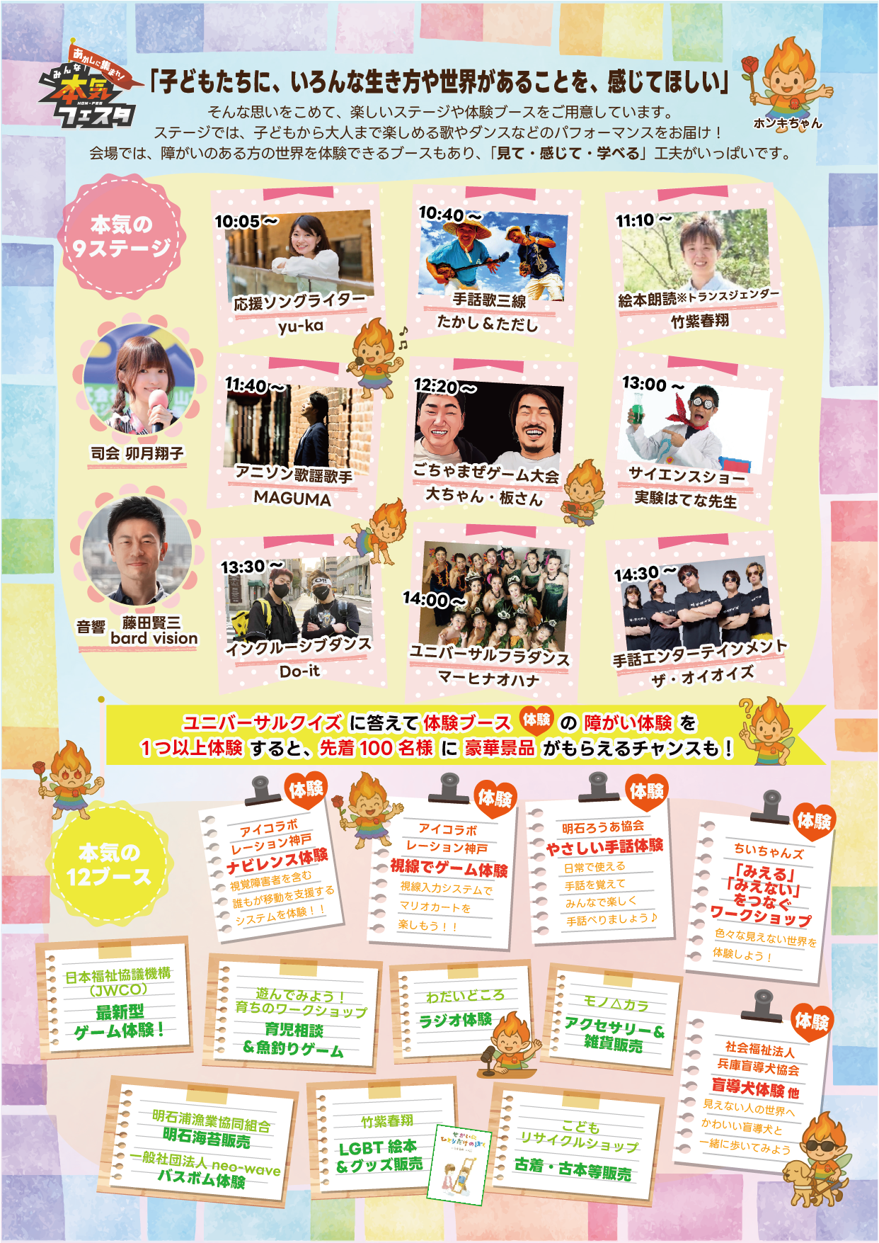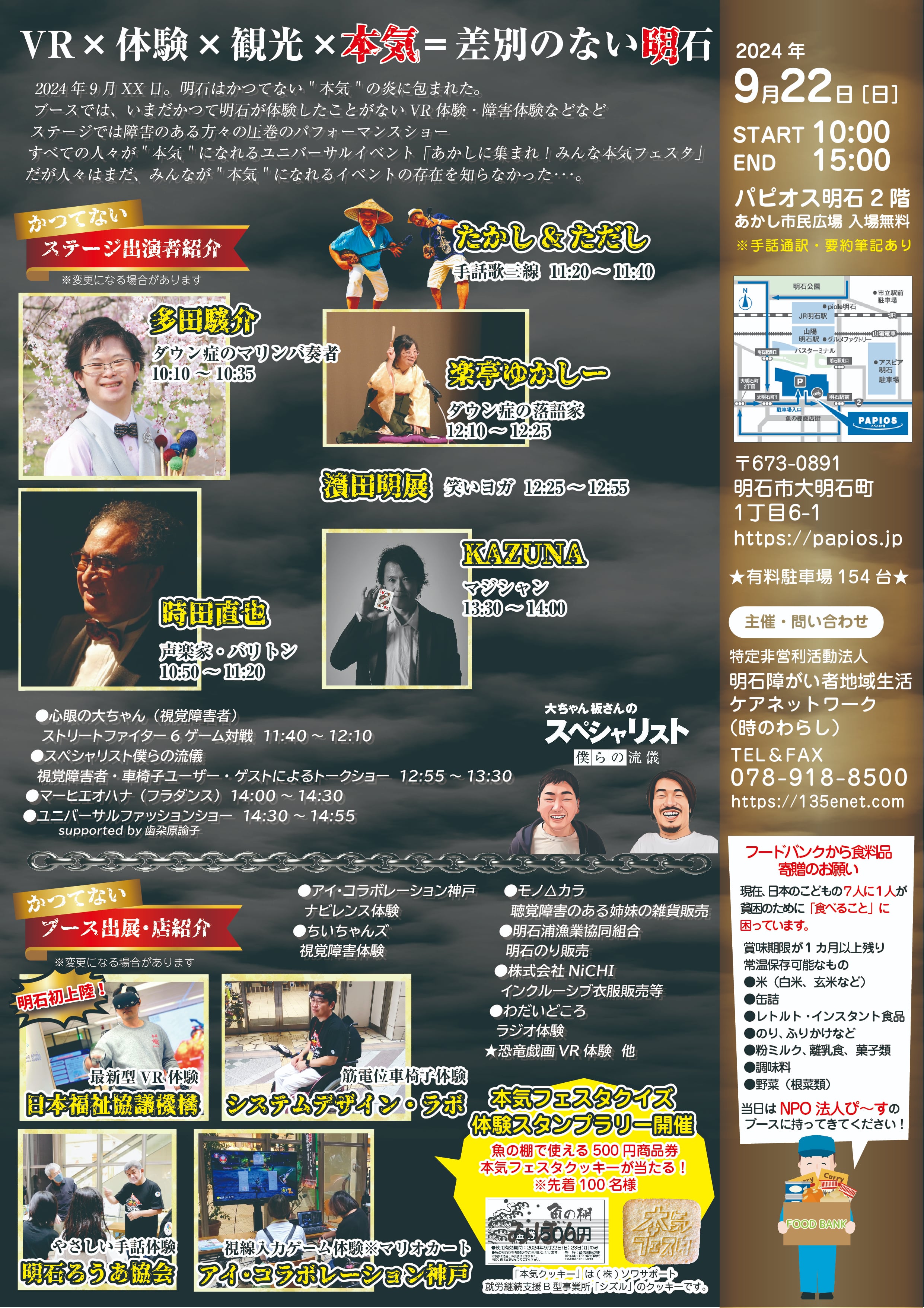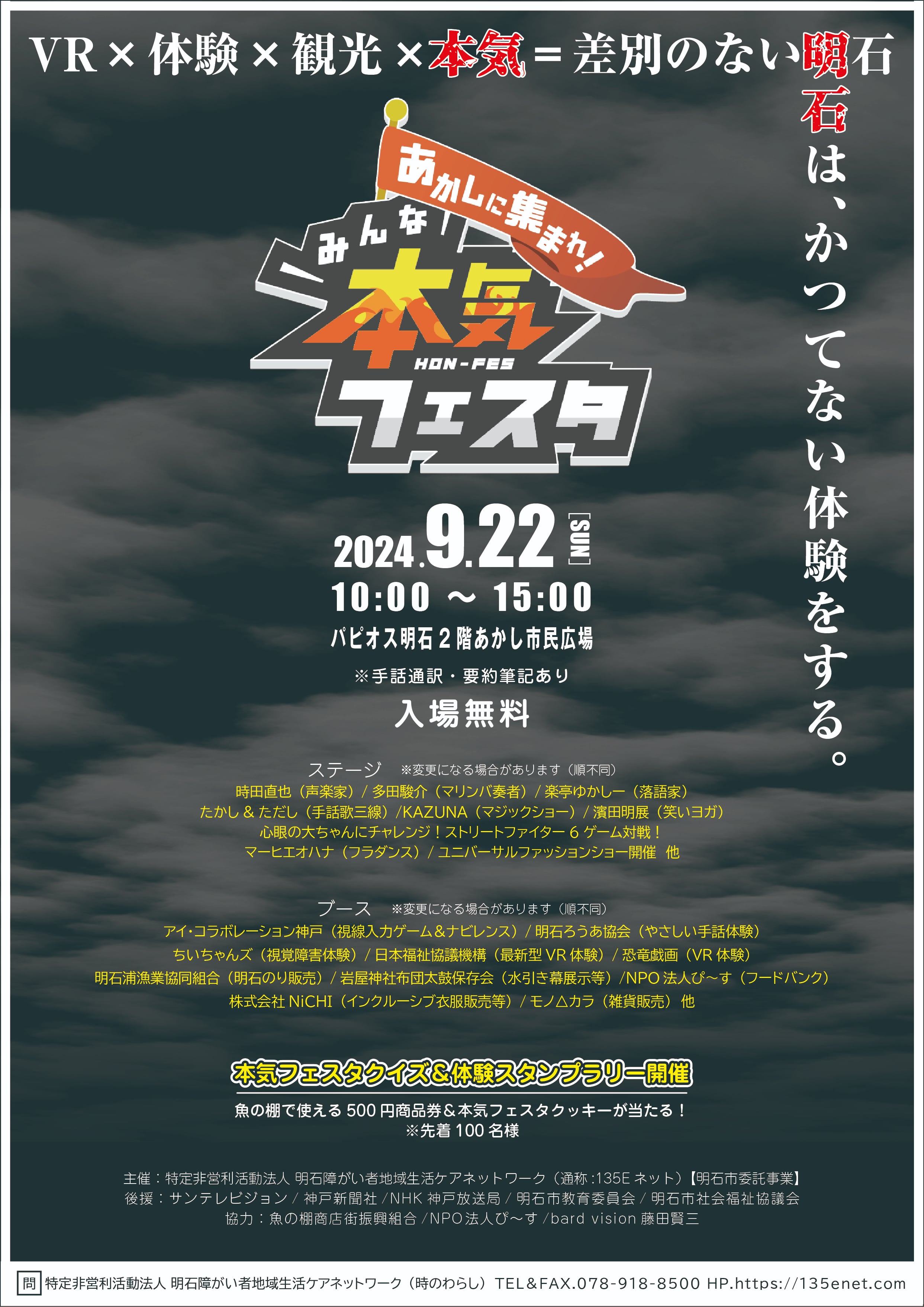 「あかしに集まれ!みんな本気フェスタ」は、明石市委託事業で特定非営利活動法人明石障がい者地域生活ケアネットワーク(略称:135Eネット)が主催し、ユニバーサル駅事業が企画し運営するユニバーサル社会の実現に向けたイベントです。